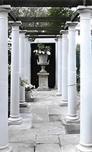 Ionischer Tempel (Ionic Temple) im römischen Stil mit sechs Säulen auf Postamenten, die mit Balustraden verbunden sind. Im Sockelboden ist eine Stern-Intarsie eingefügt. Optional mit bleifarbenem Fiberglasdom oder einem schön verzierten schmiedeeisernen Dom